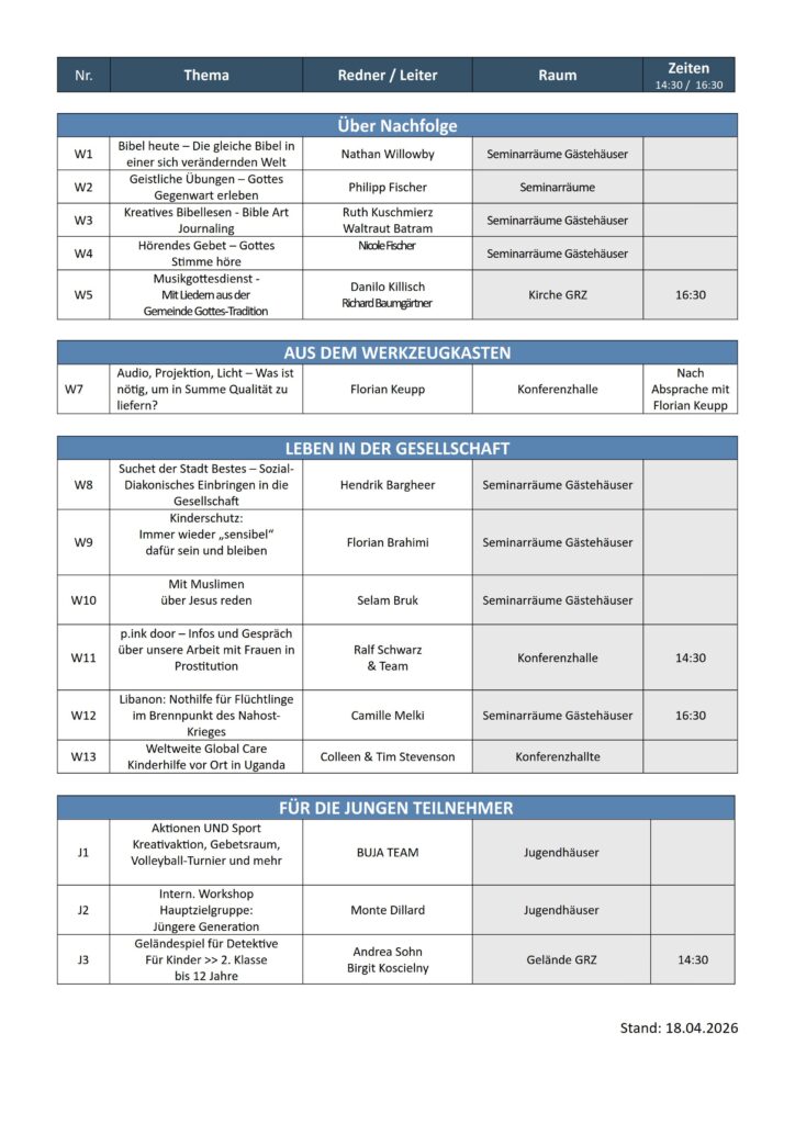 Von früh bis spät. Für Klein und Groß. Internationale Redner und Musik in Vielfalt durch Bands und Musikformationen aus Gemeinden unseres Bundes. Gemeinsames Hören, Staunen, Anbeten und Feiern in Gottesdiensten sowie in Seminaren und Workshops am Samstagnachmittag.
